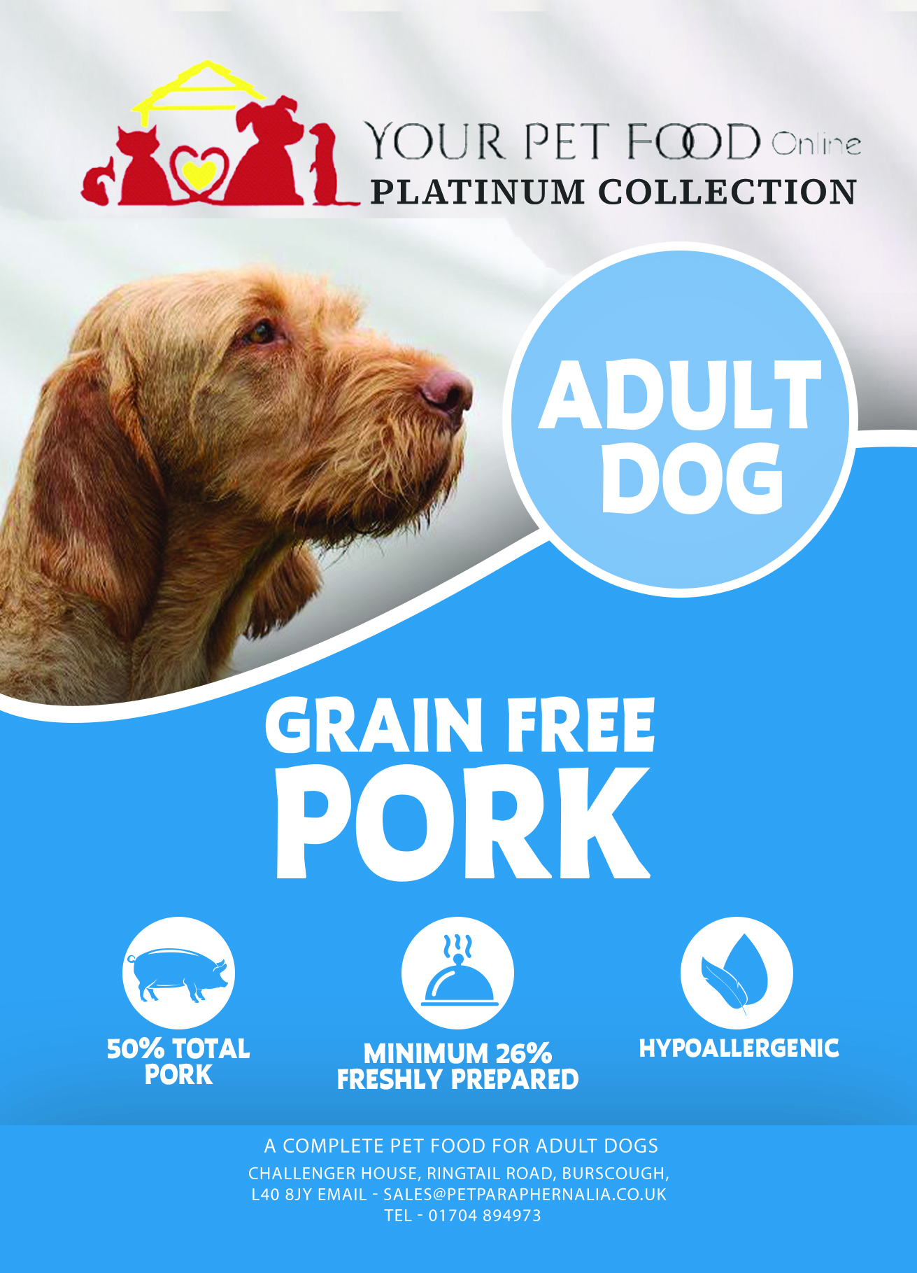 6kg, 12kg, 15kg Working Dog The finest Freshly Prepared pork is cooked at a gentle 82 degrees to protect the valuable protein, increase the digestibility and enhance the flavours. Pork is a good source of protein which also provides vitamins important for general health and well-being including thiamin, niacin, riboflavin and vitamin B6. Apples are a rich source of flavanoid antioxidants which can help to Pork 50% (including Freshly Prepared Pork 31%, Dried Pork 18% & Pork Stock 1%), Sweet Potato (22%), Peas (9%), Potato, Beet Pulp, Linseed, Omega 3 Supplement, Minerals, Apple (0.7%), Fructooligosaccharides (FOS, 96 mg/kg), Mannanoligosaccharides (MOS, 24 mg/kg) Vitamins: Vitamin A 15,000 IU, Vitamin D3 2,000 IU, Vitamin E 95 IU Trace Elements: Zinc (Zinc Sulphate Monohydrate) 50mg, Iron (Iron (II) Sulphate Monohydrate) 50mg, Manganese (Manganous Sulphate Monohydrate) 35mg, Copper (Copper (II) Sulphate Pentahydrate) 15mg, Iodine (Calcium Iodate Anhydrous) 1mg, Selenium (Sodium Selenite) 0.3mgBag Sizes