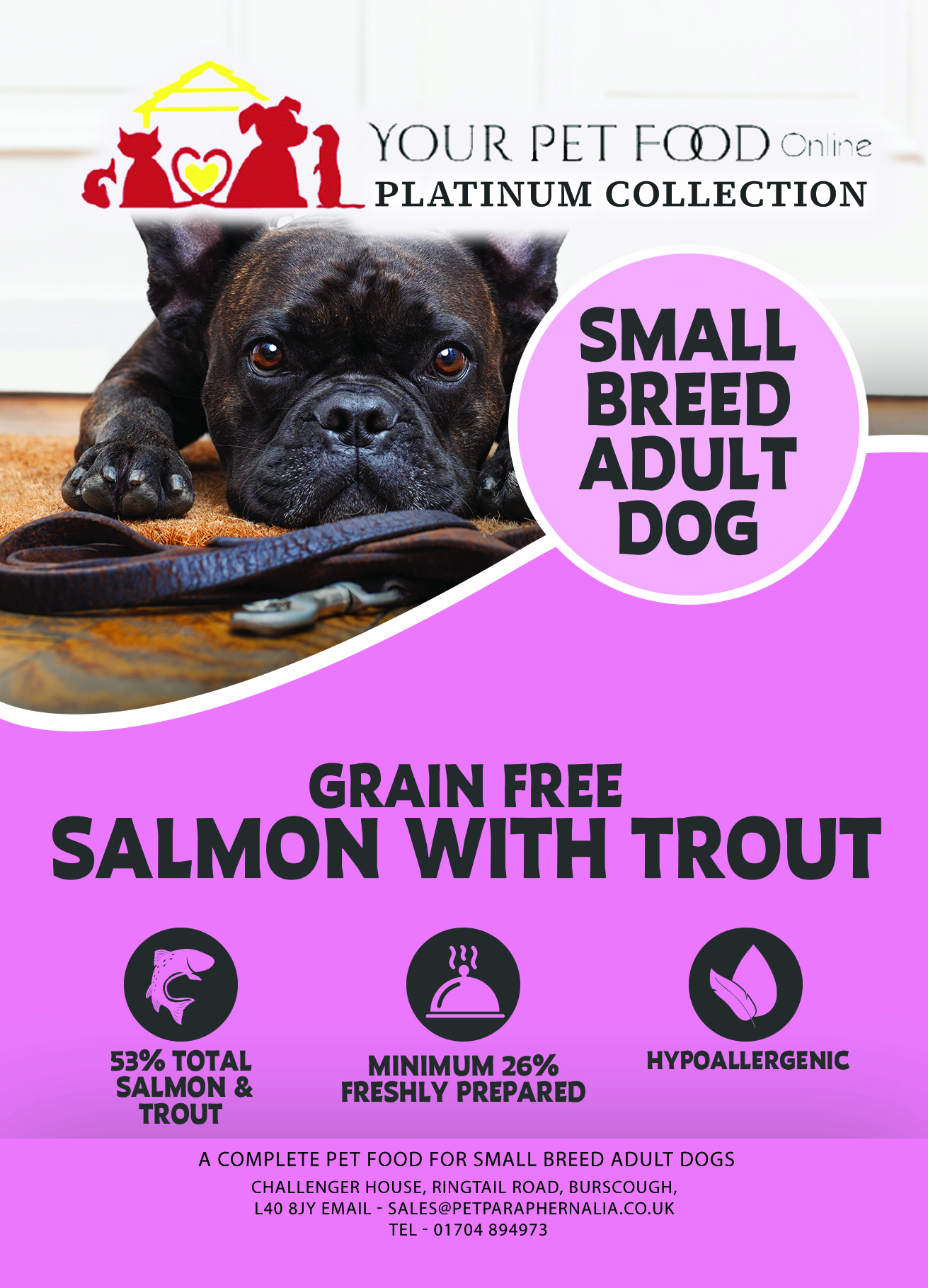Salmon & Trout 53% (including Freshly Prepared Salmon & Trout 27%, Dried Salmon 20%, Salmon Oil 4% & Salmon Stock 2%), Sweet Potato (22%), Peas (9%), Potato, Beet Pulp, Linseed, Minerals, Omega 3 Supplement, Asparagus (0.3%), Fructooligosaccharides (FOS, 96 mg/kg), Mannanoligosaccharides (MOS, 24 mg/kg)